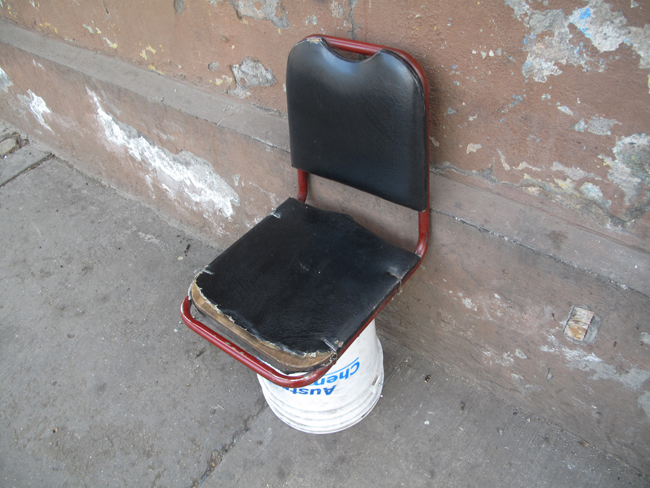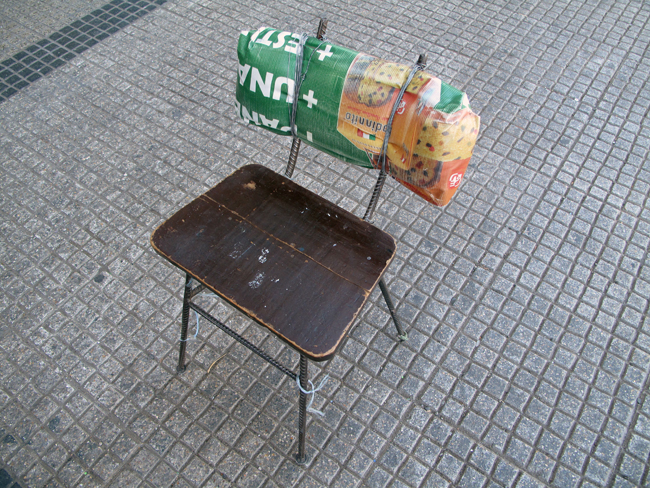 Las sillas como herramienta cotidiana fotografiadas por Sarjo, pertenecen a un gran número de trabajadores que laboran en jornadas de catorce horas y más, en oficios como cuidadores de autos, guardias, porteros y vendedores ambulantes. Son ellos, por lo tanto, quienes, en la superficie de la materia del objeto, inscriben a partir de la mano artesanal que trama, que teje, que corchetea, pega y amarra. Ellos dan forma al residuo hallado, a las bolsas de plástico, al cartón, a las mallas de naranjas, al desecho urbano; reinventando brazos, patas, soportes y espaldares esculturales que finalizan en un híbrido articulado, un injerto de trozos enchufados e introducidos en partes de otro trozo de material pobre.