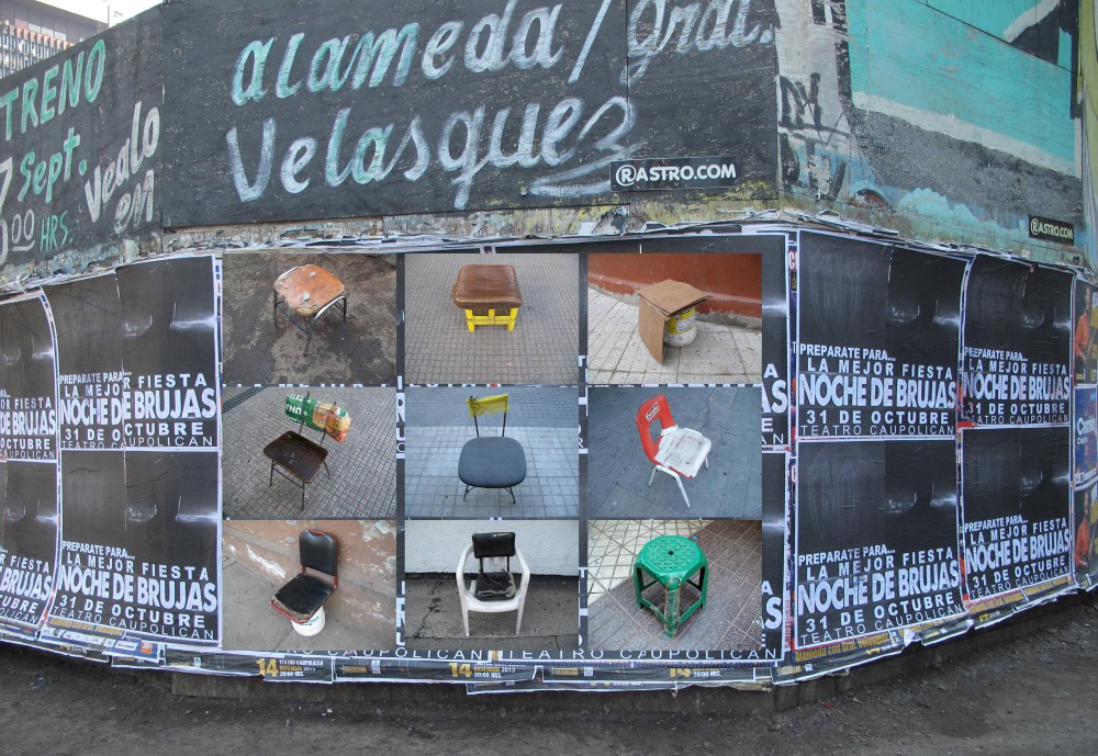 Por ello, Sarjo realiza una pegatina callejera con algunas de las fotografías de la serie Anomalie, en un formato públicamente visible que luego distribuye en los sectores santiaguinos. A su entender, la materia del desecho transita por diferentes usos y estados, siendo acomodada por diferentes autores (trabajadores) en los esqueletos y cuerpos de las sillas. Para Sarjo, la esencia de este proceso colectivo finaliza en la intervención urbana que realiza al montar algunas de las fotografías en el lugar al que pertenecen; lugar desde donde fueron fotografiadas. Es un acto de visibilidad, puesto que, en esferas artísticas conservadoras estos objetos probablemente nunca serían considerados y asignados con algún valor comercial. Con fotografías de 120 x 80 cms, las fotografías de las sillas fueron pegoteadas en los muros céntricos, como el que encontramos directamente al lado del edificio monumental del GAM (Centro Cultural Gabriela Mistral), uno de los lugares del arte oficial en Santiago de Chile. En un largo bloque de muro de cemento, el artista dispuso en grandes formatos las imágenes de las sillas pertenecientes a algunos de los trabajadores de los edificios aledaños. Otras fueron montadas en muros y rincones emblemáticos, como el rincón exterior del popular restaurant La Piojera. En este afán, Sarjo no tuvo pudor en cubrir, borrar e intervenir otras obras pintadas y exhibidas en el espacio público. En palabras del autor, “la ciudad es un espacio abierto, de perpetuo cambio”, para indicar la propia inespecificidad urbana, a modo de des-jerarquización interrogativa de lo que es considerado “arte” o “autor”. Aunque sabemos cómo funciona el arte (o tenemos una idea), se vuelve necesario replantear estos conceptos como lo hace Sarjo, pues tenemos la consciencia que muchas cosas adquieren mayor sentido que otras instaladas en las mejores galerías de la ciudad. En este plano, el concepto aurático de la obra artística exigida como creación única, nos aterriza en la necesaria dignificación de ciertos elementos, que frente a la vorágine mercantil de las vidas y los objetos, se convierten finalmente en un legado interminable de clases y subalteridades. En este quehacer, Sarjo retoma la memoria colectiva de estos objetos, en una forma de lectura narrativa —impensada — de aquellos agenciamientos urbanos que pasan desapercibidos, que son a la vez poéticos y silenciosamente violentos por su irrefutable realidad social.