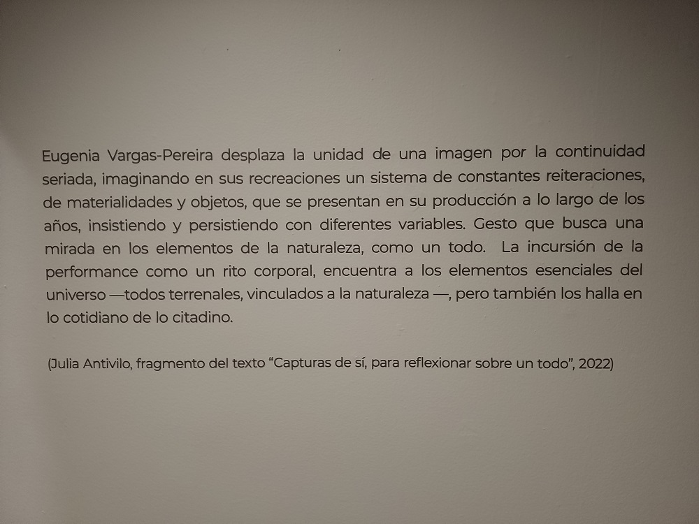Eugenia Vargas-Pereira desplaza la unidad de una imagen por la continuidad seriada, imaginando en sus recreaciones un sistema de constantes reiteraciones, de materialidades y objetos, que se presentan en su producción a lo largo de los años, insistiendo y persistiendo con diferentes variables. Gesto que busca una mirada en los elementos de la naturaleza, como un todo. La incursión de la performance como un rito corporal, encuentra a los elementos esenciales del universo —todos terrenales, vinculados a la naturaleza —, pero también los halla en lo cotidiano de lo citadino.