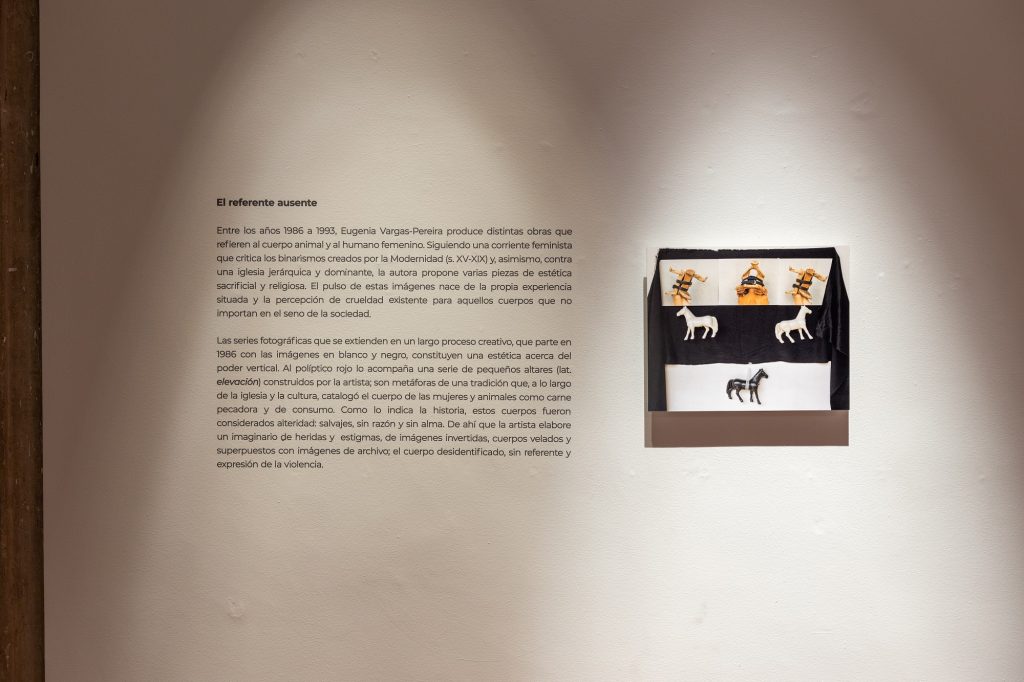Entre los años 1986 a 1993, Eugenia Vargas-Pereira produce distintas obras que refieren al cuerpo animal y al humano femenino. Siguiendo una corriente feminista que critica los binarismos creados por la Modernidad (s. XV-XIX) y, asimismo, contra una iglesia jerárquica y dominante, la autora propone varias piezas de estética sacrificial y religiosa. El pulso de estas imágenes nace de la propia experiencia situada y la percepción de crueldad existente para aquellos cuerpos que no importan en el seno de la sociedad.